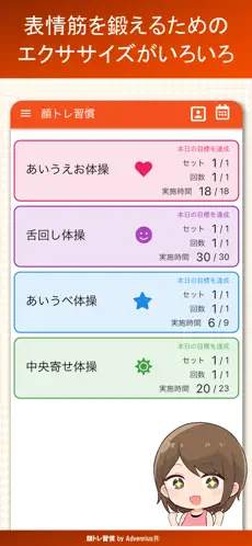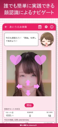 自分の顔をカメラで映しながら音声案内通りに、トレーニングをこなしていく事で、楽しみながら顔トレができるらしい
